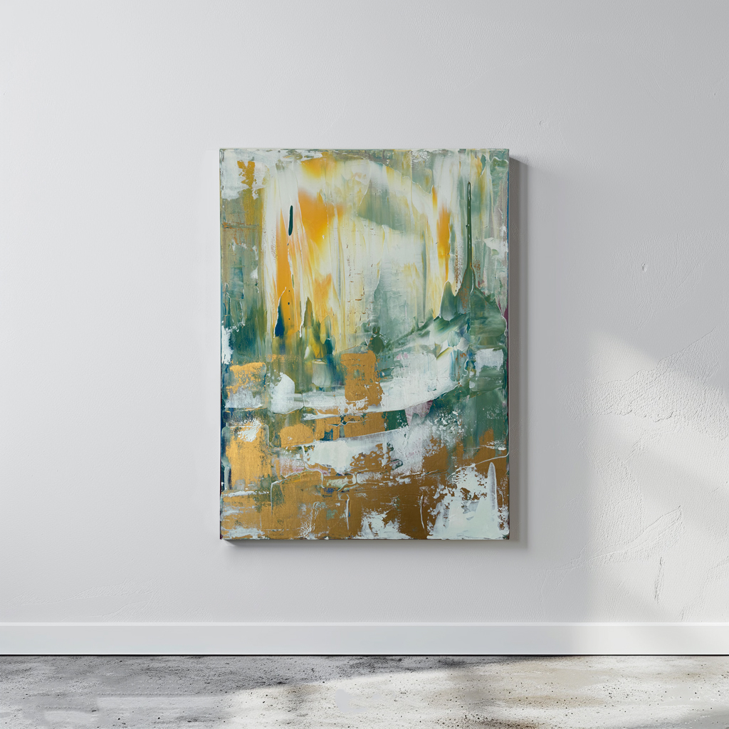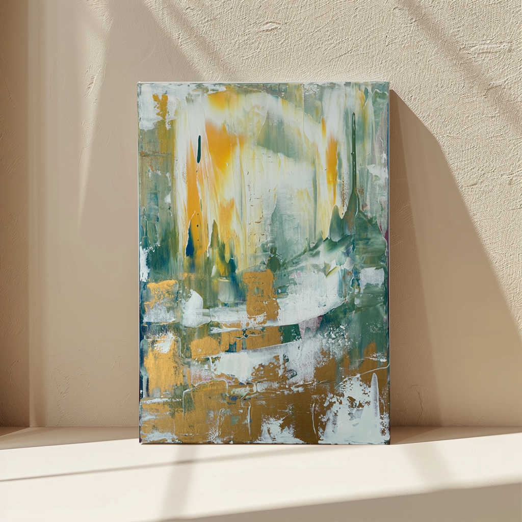 Vstupte do mystického světa „Reflexe zelených snů“, kde se příroda a fantazie prolínají v harmonii barev a tvarů. Tento abstraktní obraz je plný hlubokých zelených, zářivých žlutých a zlatých tónů, které se mění a ožívají při každém pohledu. Každá barva přináší vlastní význam – zelená evokuje klid a spojení s přírodou, žlutá rozjasňuje a symbolizuje energii, zatímco zlaté akcenty přidávají pocit luxusu a nadčasovosti.