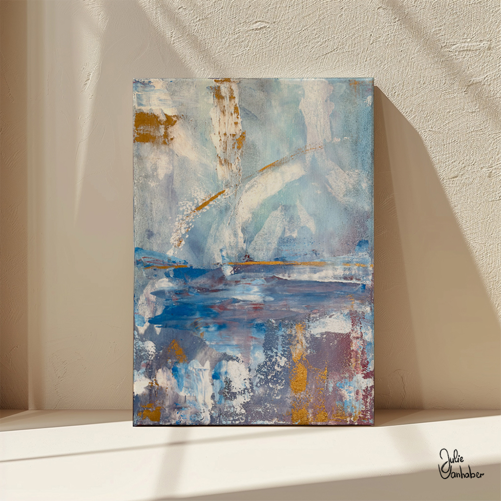 Pocítíte klid a vyrovnanost s tímto obrazem. Modré odstíny dodávají hloubku, zatímco zlaté a bílé prvky vnášejí lehkost a pozitivní energii. Je ideální pro chvíle, kdy hledáte rovnováhu a pohodu. Objevte, jak „Zátiší emocí“ dokáže zklidnit vaši mysl a přinést harmonii do vašeho prostoru.