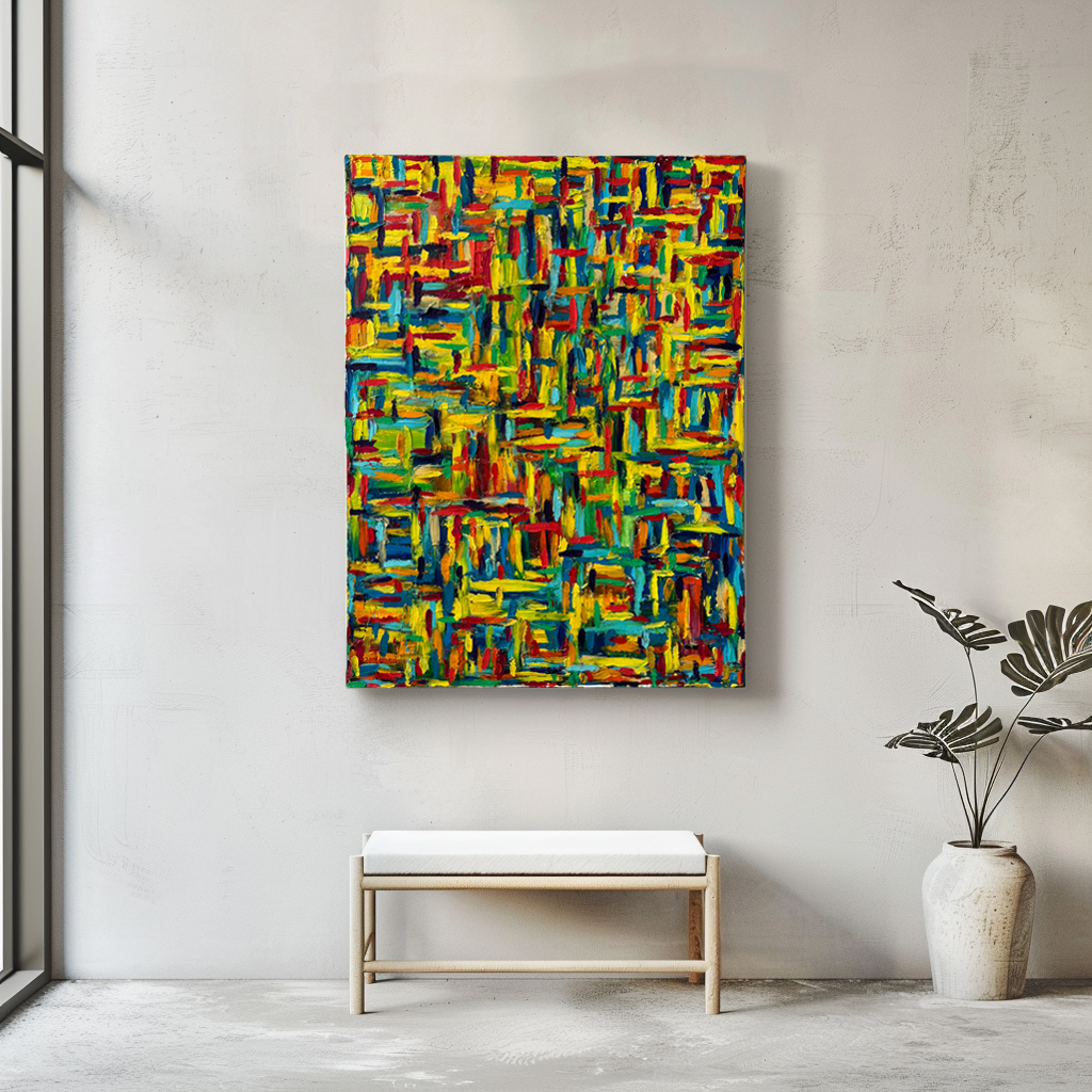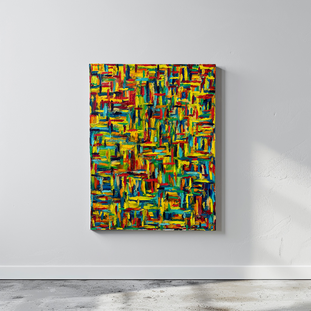 Tento obraz plný barev symbolizuje proud života a vitalitu, které z něj přímo vyzařují. Olejomalba, vytvořená technikou tahu prstem, dodává každému tahu jedinečnou texturu a dynamiku. Barevná kompozice přináší do vašeho prostoru radost, energii a optimismus. Dílo ztělesňuje koncept 5D, kde každý tah představuje hloubku a naplnění života.